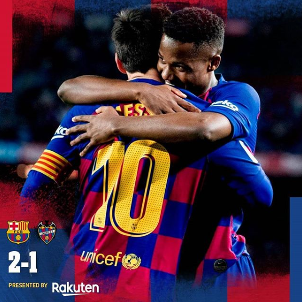 Fudbaleri Barcelone pobijedili su večeras na domaćem terenu Levante sa 2:1 u susretu 22. kola La Lige. Katalonce je do ove pobjede vodio mladi 17-godišnji Ansu Fati koji je na ovaj način oduševio Camp Nou i vjerovatno najavio veliku karijeru. On je postigao oba pogotka za svoj tim i to u razmaku od samo 100 sekundi. Prvi je postigao u 30., a drugi u 31. minuti susreta, a oba puta mu je asistitrao Leo Messi. U drugom poluvremenu Barca je stvorila nekoliko šansi preko Messija i Piquea, ali gosti su bili ti koji su došli do pogotka. Učinio je to u 93. minuti Rochina, ali tada je bilo jasno da više za Levante nema vremena da eventualno pokuša doći do boda.