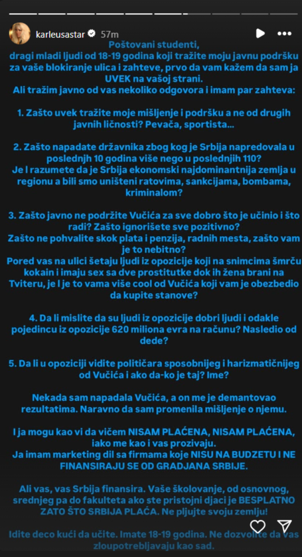 Pojedini studenti su zakrčili fakultete. Izgleda da im apel Jelene Karleuše ništa ne znači. Karleuša je glasna kada cijela estrada šuti. No nakon što je očitala lekciju studentima da je Vučić divan čovjek koji je njoj pomogao, izgađena je svim mogućim komentarima.