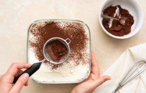 Nakon što ste posložili sve slojeve ovog kremastog deserta, nikako nemojte zaboraviti na kakao. Posipajte obilan sloj kakaa po površini deserta i u tu svrhu koristite malo sito kako biste razbili sve moguće grudice. Grudice kakaa na kolaču neće izgledati lijepo, a narušit će i ravnomjerno raspoređene okuse. Ukoliko nemate kakao, možete upotrijebiti naribanu tamnu čokoladu.