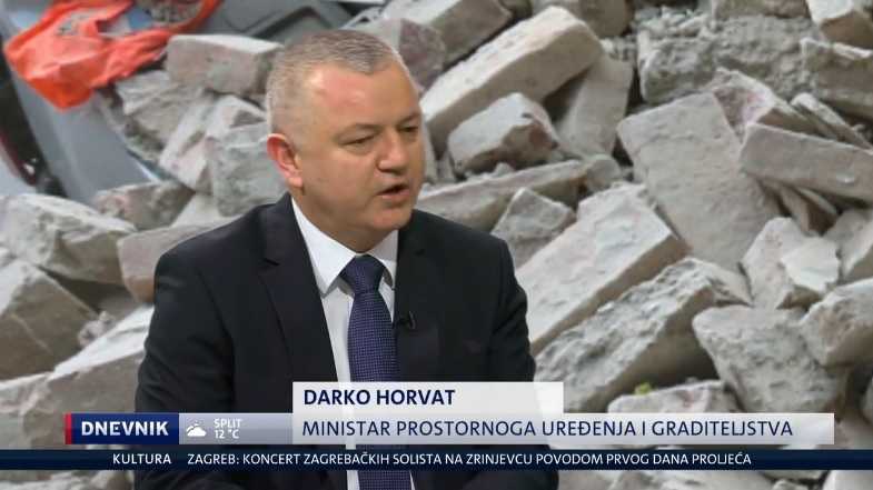 Ministar prostornoga uređenja i graditeljstva Darko Horvat rekao je u nedjelju, uoči godišnjice od potresa u Zagrebu, kako proces obnove nije zapeo, ide korak po korak, i plan je da u šestom mjesecu imamo gradilište na prostoru Zagreba i da počne organizirana obnova.
