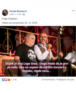 – Dragi Osječani, vidimo se na koncertu 20.12.. Niko za koncerte u Osijeku i Zagrebu nije vratio karte, to neću nikada zaboraviti – poručio je nedavno Đole.