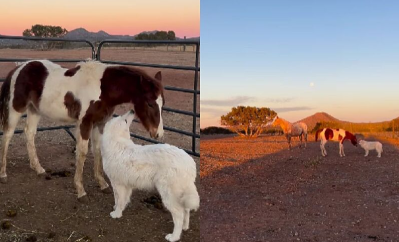 Stella Maria Ber koja živi na ranču u Novom Meksiku na svom Instagram profilu podijelila je neobičan snimak koji prikazuje posebno prijateljstvo njenog pirinejskog planinskog psa Cosma i mladog konja Skyja.
