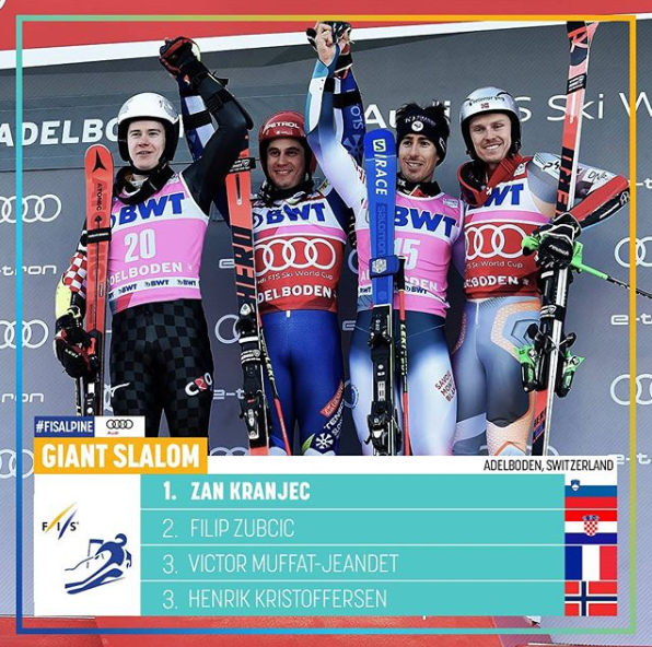 Hrvatski skijaš Filip Zubčić zauzeo je drugo mjesto u veleslalomu kojeg su skijaši u subotu vozili u švicarskom Adelbodenu, što mu je najbolji rezultat u karijeri, dok je pobjeda pripala Slovencu Žanu Kranjecu. Kranjec je u drugoj vožnji bio najbrži s vremenom, a Zubčić je bio sporiji 29 stotinki, dok treće mjesto dijele Francuz Victor Muffat–Jeandet i Norvežanin Henrik Kristoffersen . Ovo je najbolji rezultat Zubčića u karijeri i najbolji rezultat hrvatskog skijanja nakon Ivice Kostelića. Drugi hrvatski predstavnik u današnjoj utrci Elias Kolega nije se uspio plasirati u drugu vožnju, prvu je završio na 48. mjestu.