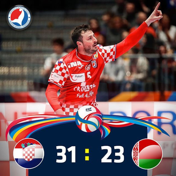 Rukometna reprezentacija Hrvatske savladala je Bjelorusiju rezultatom 31:23 u susretu 2. kola grupe A Evropskog prvenstva. Hrvatska je odlično otvorila meč. Dominirao je tim Line Červara u uvodnim minutama, pa su ubrzo stvorili pet golva prednosti. Međutim, uslijedio je popriličan pad u igri Kauboja. Bjelorusi su to iskoristili i došli su na samo gol zaostatka. Ipak, Hrvatska se ponovo budi u samoj završnici meča. Podigli su nivo igre i to im se isplatilo jer su na poluvrijeme otišli sa pet golova prednosti, 15:10. Nastavak ipak donosi mnogo sigurniju igru Hrvatske. Ovog puta nisu imali oscijalcije u igri, pa je prednost iz napada u napad rasla. Bjelorusija nije mogla napraviti apsolutno ništa i na kraju je doživjela prvi poraz na Euru, dok je Hrvatska upisala drugi trijumf. Najbolji strijelac Hrvatske danas je bio Igor Karačić sa šest golova, dok je na drugoj strani Mikita Vailupau pogodio osam puta.